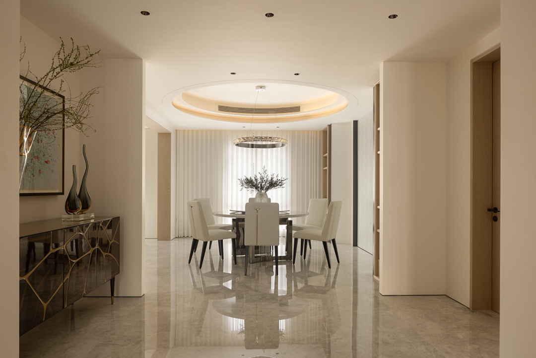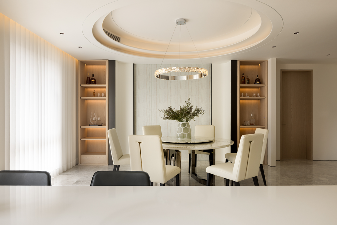 餐桌、懸掛的圓形吊燈,與頂面的造型相呼應(yīng),潛移默化地傳遞出中國(guó)人對(duì)“團(tuán)圓”的重視。