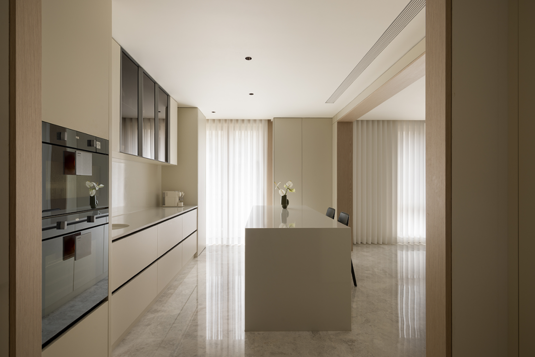 一應(yīng)俱全的廚房電器,長(zhǎng)方形的吧臺(tái),在家時(shí)就可以日咖夜酒,承載家庭生活與社交歡聚的功能。